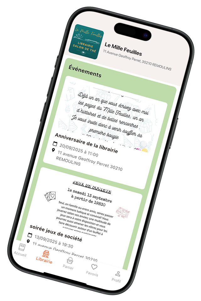 Participez à des événements culturels uniques directement organisés par votre libraire au pied de chez vous.